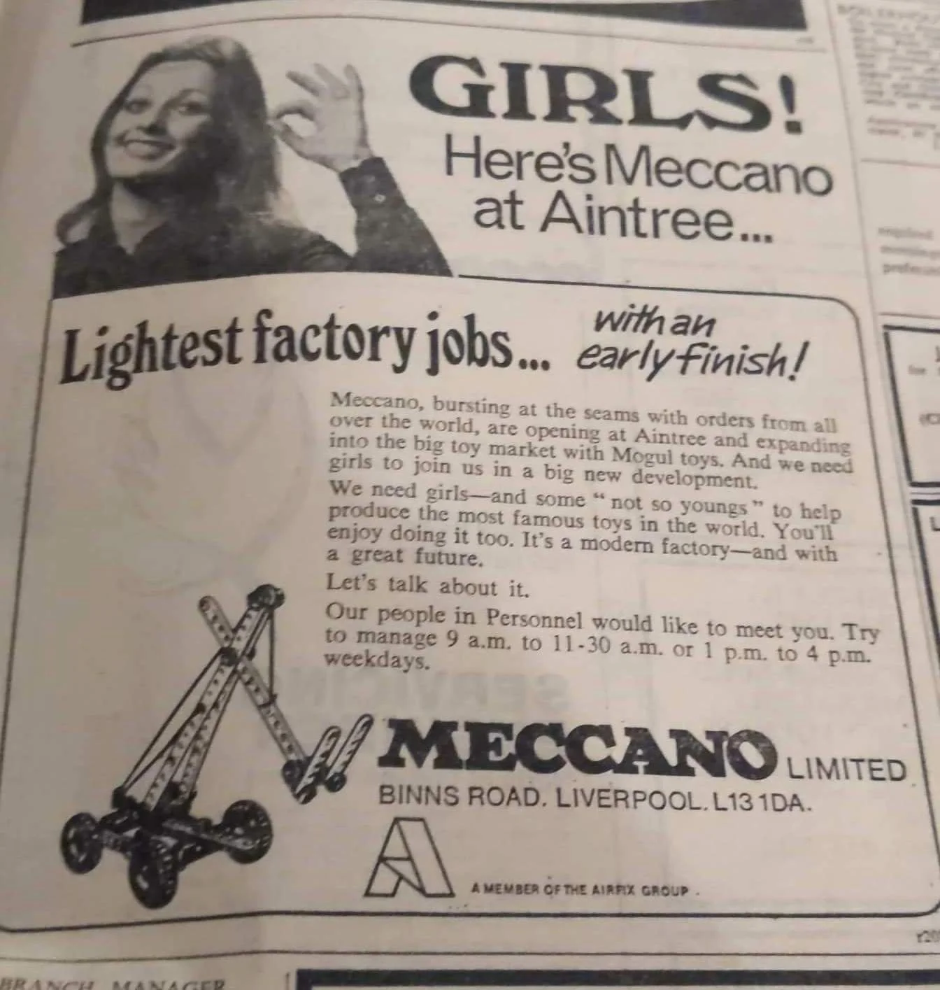 An advert recruiting women to work for Meccano, building Mogul toys at its new Aintree Factory - It dates from 1974