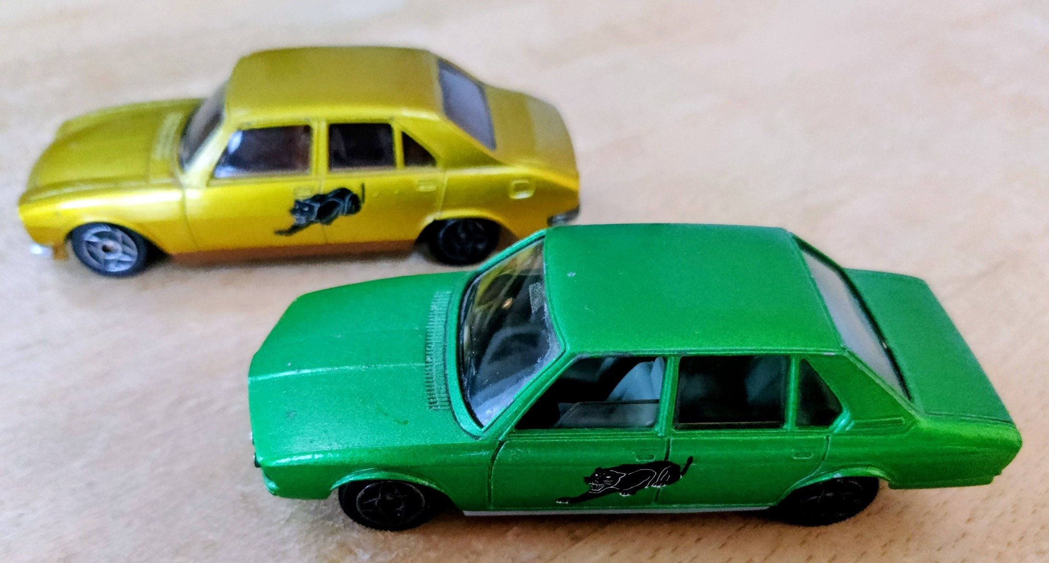 Are these Dinky Toys? Well, yes & no. They have’ Dinky Toys’ embossed into their plastic bases. The green one is a BMW 530, the gold one a Peugeot 504. They’re French Dinky Toys and were produced 1980/81.